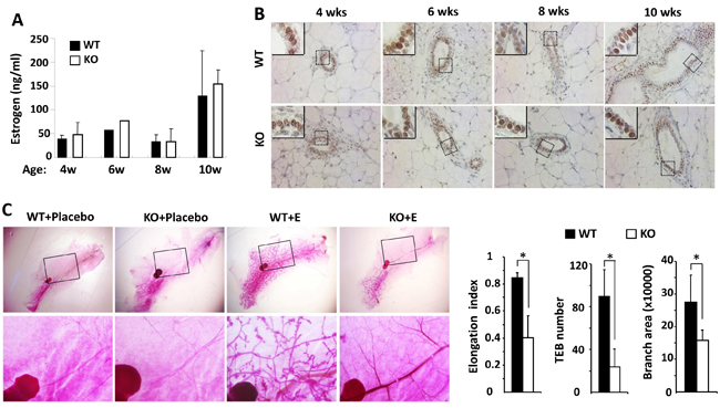 Estrogen plays a principal role in mammary gland ductal growth. To determine if estrogen levels in Kdm3a KO and WT mice could account for the differences in mammary gland ductal growth, we measured 17β-estradiol concentration in serum samples prepared from WT and Kdm3a KO female mice at 4, 6, 8 and 10 weeks of age. To our surprise, we didn’t find any discrepancy of 17β-estradiol levels in the serum samples of Kdm3a KO mice versus WT mice at all examined time points (Figure 4A). Furthermore, we also compared ERα expression by IHC in the mammary tissues collected from WT and Kdm3a KO mice at matched ages. We found no difference in either the immunostaining signal intensity or the subcellular localization of ERα in the epithelial cells of Kdm3a KO mammary glands versus WT mammary glands at all ages examined (Figure 4B). Next, we further examined whether estrogen replacement could rescue the retarded mammary gland growth in Kdm3a KO mice. We ovariectomized 4-week-old WT and Kdm3a KO mice and then treated these mice with placebo or estrogen pellets for 2 weeks. As expected, placebo treatment did not induce any ductal growth in all mice. Estrogen-treated WT mice showed robust mammary gland ductal growth; while estrogen-treated Kdm3a KO mice exhibited a significantly slower growth of their mammary gland ducts versus that in WT mice (Figure 4C). Quantitative analysis revealed that the ductal elongation index, TEB number and branch area of the estrogen-treated Kdm3a KO mammary glands were only 44%, 32% and 60% of that of the estrogen-treated WT mammary glands, respectively (Figure 4C). We also found that the mammary gland ductal growth and side branches in the ovariectomized Kdm3a KO mice treated with both estrogen and progesterone were still significantly slower and lesser compared with that in WT mice receiving the same treatment (data not shown). These results indicate that Kdm3a is not required for estrogen-induced ductal growth in the mammary gland.