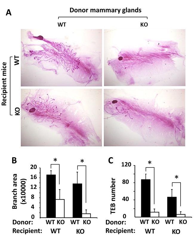 Figure 5: Mammary gland transplantation assay. A. Representative images of carmine alum-stained mammary glands in the recipient WT or Kdm3a KO mice (n = 5 in each group). These glands were re-generated from implanted donor WT and Kdm3a KO mammary gland tissues as indicated. B. & C. The mammary gland ductal branch areas and TEB numbers of the indicated mammary glands were quantitatively assayed and statistically compared by unpaired Student’s t test. *, P < 0.05.