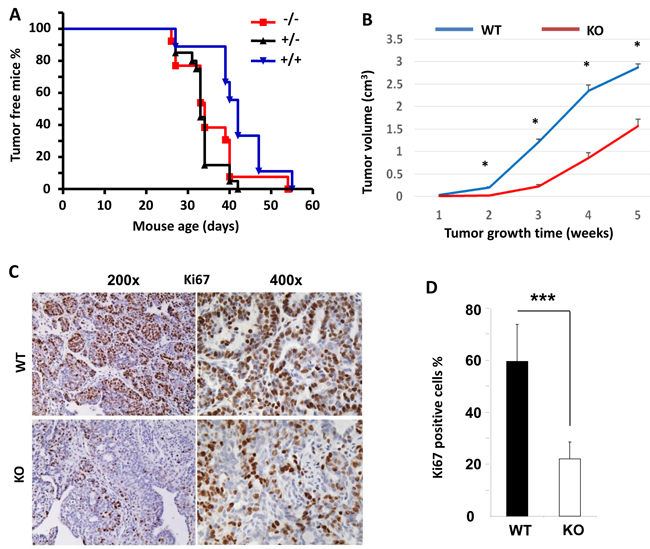 Figure 7: The effects of Kdm3a KO on the initiation and growth of PyMT-induced mammary gland tumors and the expression levels of Ki67 in the tumor cells. A. The initiation curves of palpable mammary gland tumors induced by intraductal injection of RCAS-PyMT virus into the mammary glands of MMTV-TVA×WT (+/+), MMTV-TVA×Kdm3a+/- (+/-) and MMTV-TVA×Kdm3a-/- (-/-) mice (n = 12 in each group). No significant differences were detected among the three groups by Log-rank test (p > 0.05). B. The growth curves of mammary tumors induced by RCAS-PyMT virus in MMTV-TVA×WT (WT) and MMTV-TVA×Kdm3a-/- (KO) mice (n = 12 in each group). *, p < 0.05 by unpaired t test. C. IHC for Ki67 protein in the mammary tumors of MMTV-TVA×WT (WT) and MMTV-TVA×Kdm3a-/- (KO) mice (n = 12 in each group) shown in Panel B. Images were taken at 200x and 400x magnifications. D. Percent of Ki67-positive tumor cells to total cells. Data are presented as mean ± SD, n = 12. ***, p < 0.001 by unpaired Student’s t test.