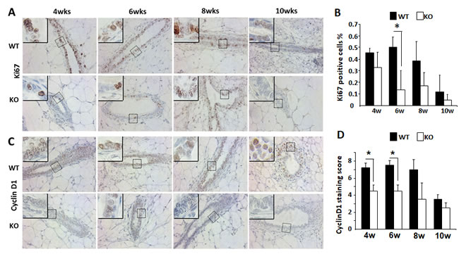 Growth factor and estrogen signaling pathways induce cyclin D1 expression and in turn, cyclin D1 accelerates G1 phase progression of the cell cycle [19]. Since the cellular proliferation rate was found decreased in Kdm3a KO mammary gland epithelial cells, we next compared cyclin D1 protein expression in the mammary gland epithelial cells of WT and Kdm3a KO mice by IHC (Figure 6C). Immunostaining revealed that the cyclin D1-positive epithelial cells in Kdm3a KO mammary glands were 30-35% of total epithelial cells from 4 to 8 weeks of age and dropped to 10% at 10 weeks of age. Moreover in WT mammary glands the cyclin D1-positive epithelial cells were approximately 50-60% of the total epithelial cells at 4 to 8 weeks of age and 20% at10 weeks of age. The intensity of cyclin D1 immunoreactivity was also higher in WT mammary gland epithelial cells versus Kdm3a KO mammary gland epithelial cells in most samples examined. Quantitative analysis of the combined immunostaining scores demonstrated that the overall cyclin D1 expression was significantly lower in Kdm3a KO versus WT mammary gland epithelial cells at 4 and 6 weeks of age (Figure 6D). These results suggest that Kdm3a is required for normal cyclin D1 expression during the pubertal fast mammary gland ductal growth phase at 4-6 weeks of age.