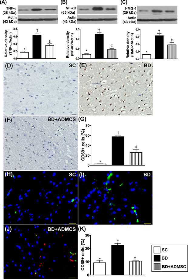 To measure the proinflammatory biomarkers in the brain tissue, Western blot analysis was used. The results showed that the protein expression of TNF-α and nuclear factor (NF)-κB, two indicators of inflammation and high mobility group protein-1 (HMG-1), an indicator of cytokine mediator of inflammation, were higher in BD than in SC and BDMSC, and significantly higher in BDMSC than in SC (Figure 3). Additionally, cellular expressions of CD69+ and F4/80+ cells (i.e., a macrophage surface marker), two indices of inflammation, exhibited an identical pattern of protein expression of inflammation among the three groups (Figure 3).