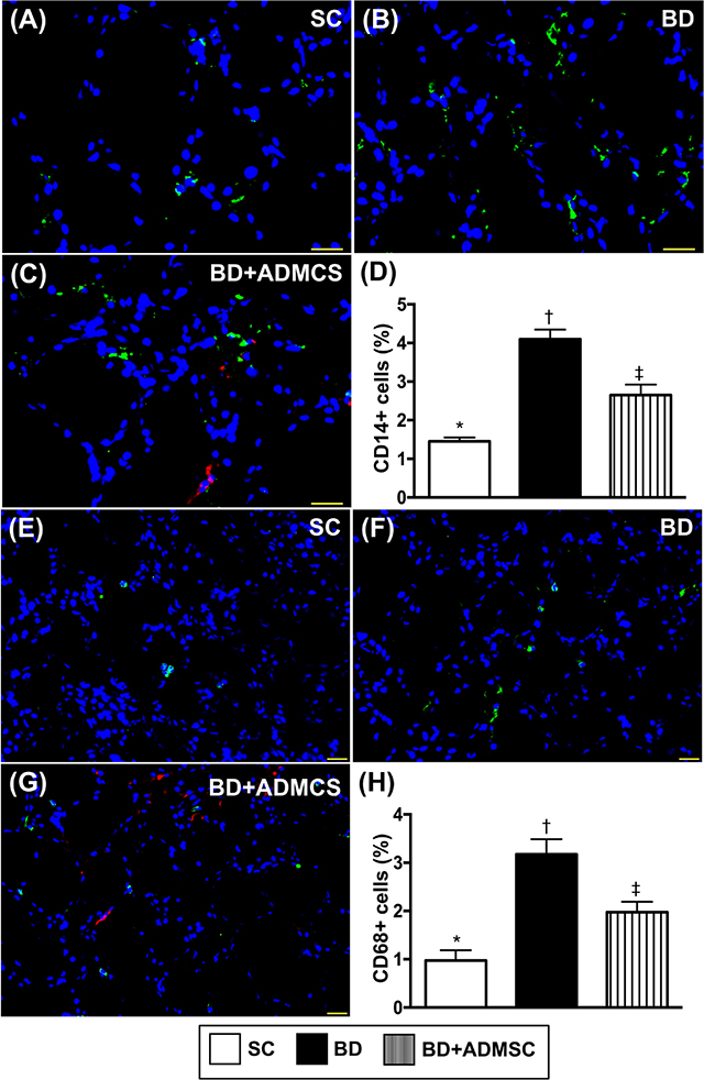 To elucidate the circulating level of inflammatory reaction after BD, the enzyme-linked immunosorbent assay (ELISA) and flow cytometric analysis were utilized in the present study. The results of ELISA showed that at 6 h after BD procedure, circulating levels of tumor necrosis factor (TNF)- α, interleukin (IL)-6, and myeloperoxidase (MPO), three indicators of inflammatory markers implicating innate immune response, were higher in the BD group than in the sham control (SC) and the BD + ADMSC group (BDMSC), and significantly higher in BDMSC group than in SC.