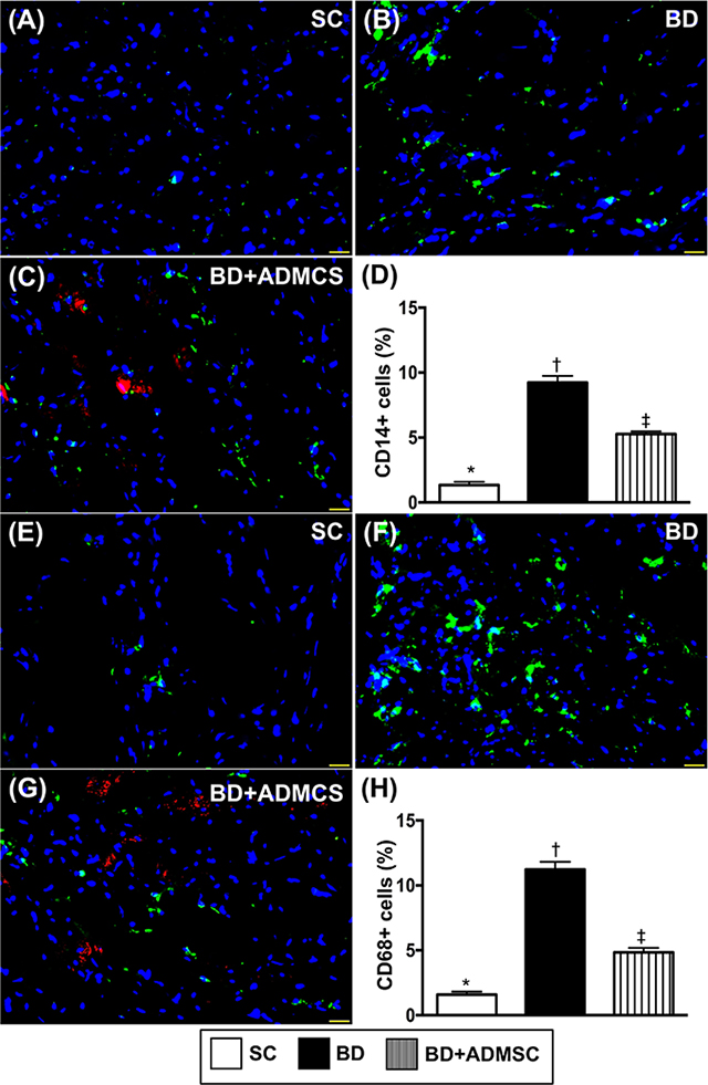 Figure 4: Cellular expressions of inflammatory biomarkers in heart at 6 h after BD procedure. (A-C) Illustrating immunofluorescent (IF) microscopic finding (400x) for identifying CD14+ cells (green color). Red color in [4] indicated some Dil-dye positively-stained ADMSCs in heart tissue. (D) Analytical result of number of positively-stained CD cells, * vs. other groups with different symbols (†, ‡), p<0.0001. (E to G) IF microscopic finding (400x) for identifying CD68+ cells (green color). Red color in (G) indicated some Dil-dye positively-stained ADMSCs in heart tissue. (H) Analytical result of number of positively-stained CD68+ cells, * vs. other groups with different symbols (†, ‡), p<0.0001. The scale bars in right lower corner represent 20 μm. All statistical analyses were performed by one-way ANOVA, followed by Bonferroni multiple comparison post hoc test (n=8). Symbols (*, †, ‡) indicate significance (at 0.05 level). BD = brain death; group A1 = sham control; group A2 = brain death; group A3 = brain death + adipose-derived mesenchymal stem cell (ADMSC).