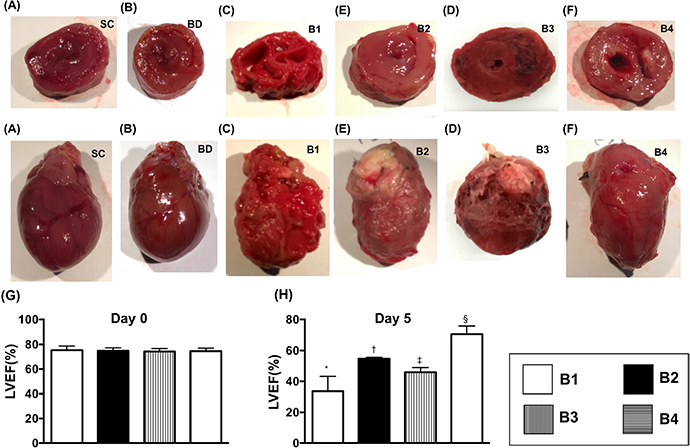 Figure 7: Anatomical-pathological findings and echocardiographic findings by day 5 after BD. (A to F) Illustration of anatomical-pathological findings of the hearts (i.e., whole heart and cross section) in groups: sham control (A), BD animal [1], donor heart of BD animal (i.e., Fischer344=F344) transplanted into recipient (i.e., Lewis) without treatment [4], F344 heart transplanted to Lewis + ADMSC administration at days 1 and 3 post-transplanted procedure (D), F344 heart transplanted to Lewis + ADMSC administration at 3 h after BD procedure (E), and F344 heart transplanted to Lewis + ADMSC administration at 3 h after BD and by days 1 and 3 after heart transplanted procedure [3]. The pathological findings showed that as compared with the other groups, the transplanted heart [4] was severely destroyed at day 5 after transplantation procedure, suggesting an occurrence of acute transplanted heart rejection. (G and H) Transthoracic echocardiographic findings for identification of left ventricular ejection fraction (LVEF). By day 0 (G): p>0.5. By day 5 [1], * vs. other groups with different symbols (†, ‡, §), p<0.0001. All statistical analyses were performed by one-way ANOVA, followed by Bonferroni multiple comparison post hoc test (n=8). Symbols (*, †, ‡, §) indicate significance (at 0.05 level). B1 = F344 heart transplanted into Lewis by 6 h after BD; B2 = BD induction for 6 h followed by heart transplantation and ADMSC (1.2x106 cells) transfused into recipient at days 1 and 3, respectively after transplantation; B3 = BD + ADMSC (1.2x106 cells) at 3 h and heart transplantation at 6 h after BD; B4 = BD + ADMSC (1.2x106 cells) at 3h and heart transplantation at 6 h after BD, followed by ADMSC (1.2x106 cells) transfusion to recipient by days 1 and 3, respectively after heart transplantation. BD = brain death; ADMSC = adipose-derived mesenchymal stem cell.