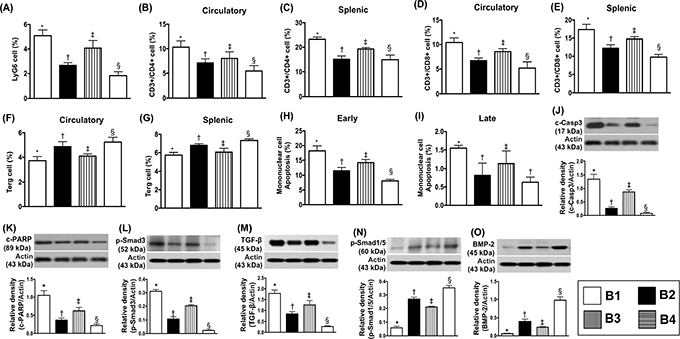 Figure 8: Flow cytometric analysis of inflammatory cells in circulation and spleen and the protein expressions of apoptotic, fibrotic and anti-fibrotic biomarkers by day 5 after heart transplantation. (A) Circulating level of Ly6G, * vs. other groups with different symbols (†, ‡, §), p<0.001. (B) Circulating levels of CD3+/CD4+ cells, * vs. other groups with different symbols (†, ‡, §), p<0.001. (C) Splenic levels of CD3+/CD4+ cells, * vs. other groups with different symbols (†, ‡, §), p<0.001. (D) Circulating levels of CD3+/CD8+ cells, * vs. other groups with different symbols (†, ‡, §), p<0.001. (E) Splenic levels of CD3+/CD8+ cells, * vs. other groups with different symbols (†, ‡, §), p<0.001. (F) Circulating levels of Treg cells (CD4+CD25+Foxp3+ cells), * vs. other bars with different symbols (†, ‡, §), p<0.001. (G) Splenic levels of Treg cells, * vs. other groups with different symbols (†, ‡, §), p<0.001, p<0.001. (H) Early apoptosis, * vs. other groups with different symbols (†, ‡, §), p<0.001. (I) Late apoptosis, * vs. other groups with different symbols (†, ‡), p<0.001. (J) Protein expression of cleaved caspase 3 (c-Casp 3), * vs. other groups with different symbols (†, ‡, §), p<0.0001. (K) Protein expression of cleaved poly (ADP-ribose) polymerase (c-PARP), * vs. other groups with different symbols (†, ‡, §), p<0.0001. (L) Protein expression of phosphorylated (p)-Smad3, * vs. other groups with different symbols (†, ‡, §), p<0.0001. (M) Protein expression of transforming growth factor (TGF)-ß, * vs. other groups with different symbols (†, ‡, §), p<0.0001. (N) Protein expression of p-Smad1/5, * vs. other groups with different symbols (†, ‡, §), p<0.0001. (O) Protein expression of bone morphogenetic protein (BMP)-2, * vs. other groups with different symbols (†, ‡, §), p<0.0001. All statistical analyses were performed by one-way ANOVA, followed by Bonferroni multiple comparison post hoc test (n=8). Symbols (*, †, ‡, §) indicate significance (at 0.05 level). B1 = F344 heart transplanted into Lewis by 6 h after BD; B2 = BD induction for 6 h followed by heart transplantation and ADMSC (1.2x106 cells) transfused into recipient at days 1 and 3, respectively after transplantation; B3 = BD + ADMSC (1.2x106 cells) at 3 h and heart transplantation at 6 h after BD; B4 = BD + ADMSC (1.2x106 cells) at 3h and heart transplantation at 6 h after BD, followed by ADMSC (1.2x106 cells) transfusion to recipient by days 1 and 3, respectively after heart transplantation. BD = brain death; ADMSC = adipose-derived mesenchymal stem cell.