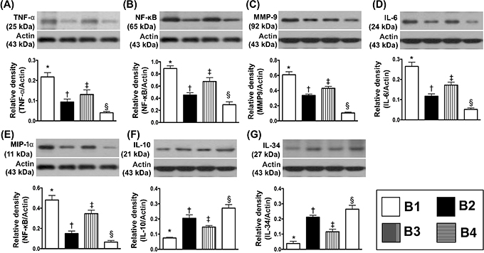 Figure 9: Protein expressions of inflammatory biomarkers in transplanted heart by day 5 after heart transplantation. (A) Protein expression of tumor necrosis factor (TNF)-α, * vs. other groups with different symbols (†, ‡, §), p<0.001. (B) Protein expression of nuclear factor (NF)- κB, * vs. other groups with different symbols (†, ‡, §), p<0.0001. (C) Protein expression of matrix metalloproteinase (MMP)-9, * vs. other groups with different symbols (†, ‡, §), p<0.0001. (D) Protein expression of interleukin [6]-6, * vs. other groups with different symbols (†, ‡, §), p<0.0001. (E) Protein expression of macrophage inflammatory protein (MIP)-1α, * vs. other groups with different symbols (†, ‡, §), p<0.0001. (F) Protein expression of IL-10, * vs. other groups with different symbols (†, ‡, §), p<0.0001. (G) Protein expression of IL-34, * vs. other groups with different symbols (†, ‡, §), p<0.0001. All statistical analyses were performed by one-way ANOVA, followed by Bonferroni multiple comparison post hoc test (n=8). Symbols (*, †, ‡, §) indicate significance (at 0.05 level). B1 = F344 heart transplanted into Lewis by 6 h after BD; B2 = BD induction for 6 h followed by heart transplantation and ADMSC (1.2x106 cells) transfused into recipient at days 1 and 3, respectively after transplantation; B3 = BD + ADMSC (1.2x106 cells) at 3 h and heart transplantation at 6 h after BD; B4 = BD + ADMSC (1.2x106 cells) at 3h and heart transplantation at 6 h after BD, followed by ADMSC (1.2x106 cells) transfusion to recipient by days 1 and 3, respectively after heart transplantation. BD = brain death; ADMSC = adipose-derived mesenchymal stem cell.