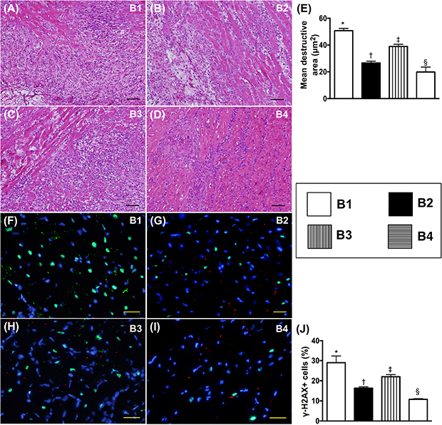 Figure 10: Histopathological finding and DNA-damaged marker in transplanted heart by day 5 after heart transplantation. (A to D) Illustrating the light microscopic finding (100x) of H & E stain for identifying the destructive area (blue-colored fibrotic area). The scale bars in right lower corner represent 100 μm. (E) Analytic result of the destructive area, * vs. other groups with different symbols (†, ‡, §), p<0.0001. (F to I) Illustrating the microscopic finding (400x) of immunofluorescent stain for identification of γ-H2AX+ cells (green color). The scale bars in right lower corner represent 20 μm. (J) Analytic results of number of positively-stained γ-H2AX cells, * vs. other groups with different symbols (†, ‡, §), p<0.0001. All statistical analyses were performed by one-way ANOVA, followed by Bonferroni multiple comparison post hoc test (n=8). Symbols (*, †, ‡, §) indicate significance (at 0.05 level). B1 = F344 heart transplanted into Lewis by 6 h after BD; B2 = BD induction for 6 h followed by heart transplantation and ADMSC (1.2x106 cells) transfused into recipient at days 1 and 3, respectively after transplantation; B3 = BD + ADMSC (1.2x106 cells) at 3 h and heart transplantation at 6 h after BD; B4 = BD + ADMSC (1.2x106 cells) at 3h and heart transplantation at 6 h after BD, followed by ADMSC (1.2x106 cells) transfusion to recipient by days 1 and 3, respectively after heart transplantation. BD = brain death; ADMSC = adipose-derived mesenchymal stem cell.