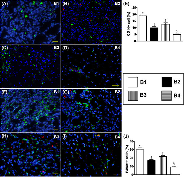 Figure 12: Cellular expressions of inflammatory biomarkers in transplanted heart by day 5 after heart transplantation. (A to D) Illustrating microscopic finding (400x) of immunofluorescent (IF) staining for identification of CD14+ cells (green color). Red color in (B, C, D) indicated some Dil-dye positively-stained ADMSCs in heart tissue. (E) Analytical results of number of positively-stained CD14 cells, * vs. other groups with different symbols (†, ‡, §), p<0.0001. (F to I) Illustrating microscopic finding of IF staining for identification of F4/80+ cells (green color). Red color in (G, H, I) indicated some Dil-dye positively-stained ADMSCs in heart tissue. (J) Analytical results of number of positively-stained F4/80 cells, * vs. other groups with different symbols (†, ‡, §), p<0.0001. The scale bars in right lower corner represent 20 μm. All statistical analyses were performed by one-way ANOVA, followed by Bonferroni multiple comparison post hoc test (n=8). Symbols (*, †, ‡, §) indicate significance (at 0.05 level). B1 = F344 heart transplanted into Lewis by 6 h after BD; B2 = BD induction for 6 h followed by heart transplantation and ADMSC (1.2x106 cells) transfused into recipient at days 1 and 3, respectively after transplantation; B3 = BD + ADMSC (1.2x106 cells) at 3 h and heart transplantation at 6 h after BD; B4 = BD + ADMSC (1.2x106 cells) at 3h and heart transplantation at 6 h after BD, followed by ADMSC (1.2x106 cells) transfusion to recipient by days 1 and 3, respectively after heart transplantation. BD = brain death; ADMSC = adipose-derived mesenchymal stem cell.