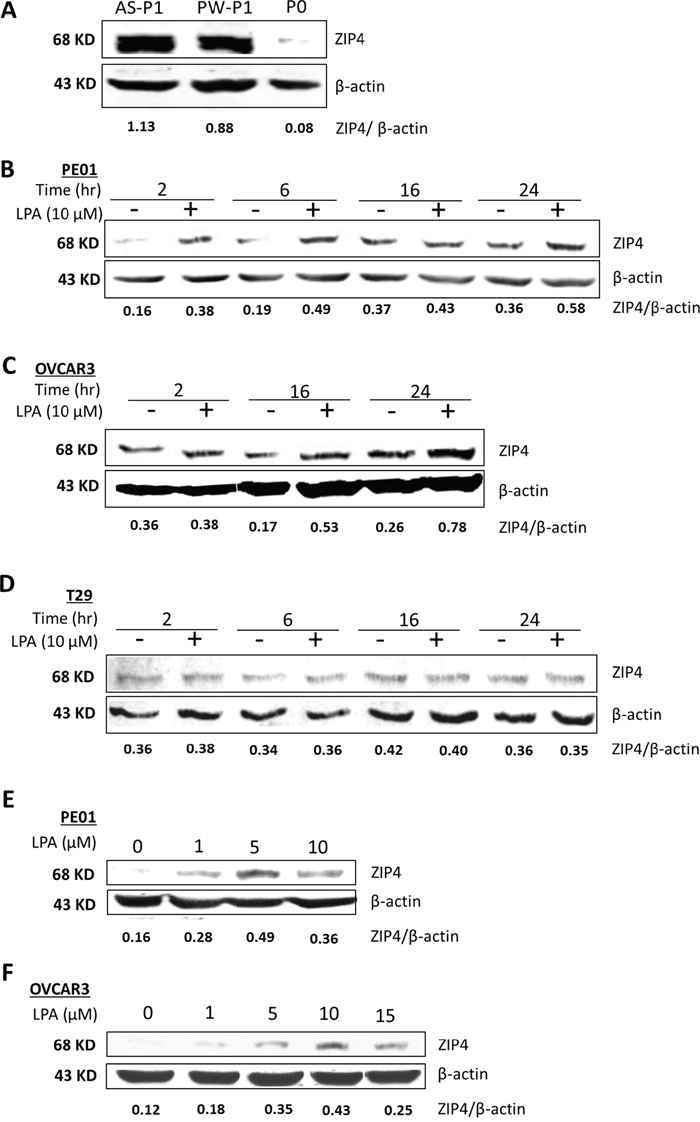 Our preliminary data suggest that PE01 (or PE04) and OVCAR3 cells may have differential epigenetic regulations [e.g. trichostatin A, an inhibitor of histone deacetylase (HDAC) families of enzymes, did not affect LPA-induced ZIP4 in PE01 cells but blocked this action in OVCAR3 cells; our unpublished observations). These additional layers of regulation may affect the optimal time of LPA-induced ZIP4. In addition, we found that ZIP4 expression could be stress stimulated. Cell starvation appears to have regulatory effect on ZIP4, and hence the basal levels of ZIP4 during starvation may change as we observed in Figure 1. Moreover, ZIP4 appeared to be doublets in ID8 cells in Western blots detected by a mouse anti-ZIP4 antibody, but the human ZIP4 antibody (cross-react with mouse ZIP4) detected ZIP4 as a single band. These aspects warrant further investigation.