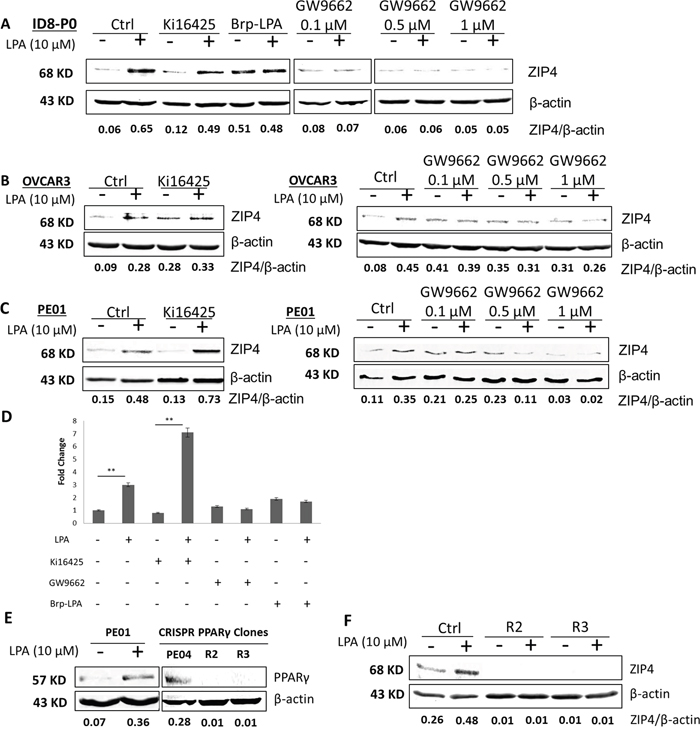 Figure 2: PPARγ was important for LPA induced ZIP4 up-regulation via in EOC cells. (A-C) ID8, OVCAR3 and PE01 cells were starved from serum for 16 hr when the confluence was at ~80%. The cells were pre-treated with Ki16425 (10 μM), GW9662 (0.1 to 1 μM), or BrP-LPA (10 μM prior to stimulation with LPA (10 μM) (D) Summery of three independent experiments conducted in PE01 cells. (E-F) Human PE01 cell expressed lower level of PPARγ, which was up-regulated by LPA (10 μM). In PE04 cells, control-vector-transfected and CRISPR PPARγ-KO single clones were seeded into 24-well plate (2x105 cells/ well) and cultured for 24 hr. Western-blot analyses were performed to examine the expression levels of PPARγ and ZIP4 in the presence or absence of LPA (10 μM) in PE01 and PE04 cells. Representative results from ≥ three repetitive experiments are shown.