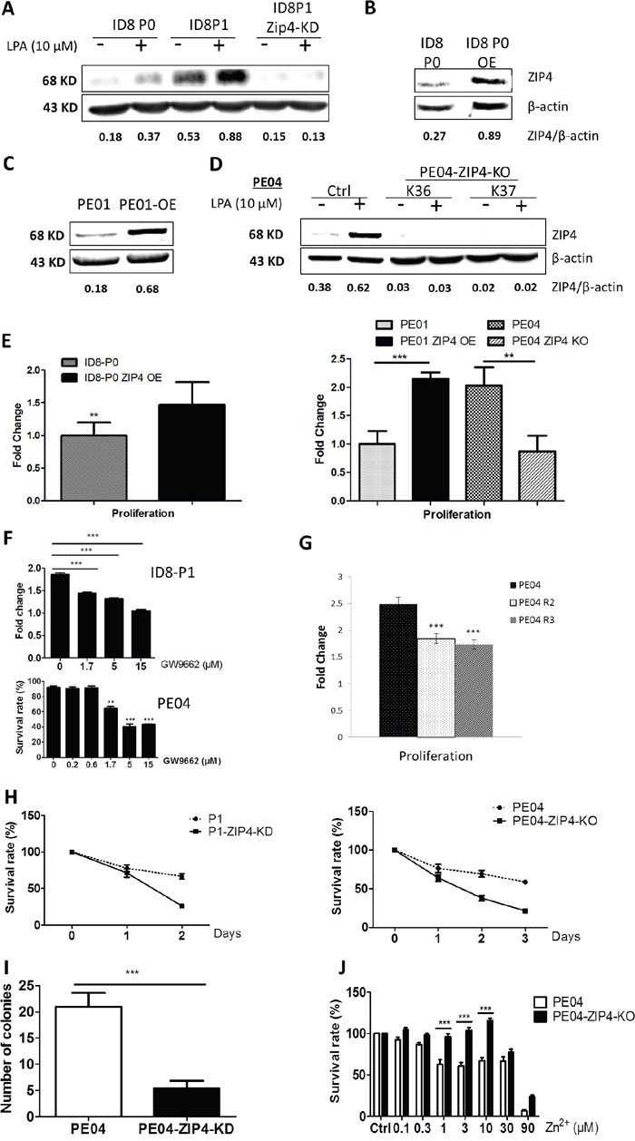 Figure 3: ZIP4 was functionally involved in cell proliferation, anoikis-resistance, and colony formation in HGSOC cells. (A) LPA induced ZIP4 in ID8-P0 and ID8–P1 cells; ID8-P1-Zip4-KD clone was established using shRNA against Zip4. (B) ID8-P0 ZIP4 over-expression (OE) cells. (C) PE01-ZIP4-OE cells. (D) ZIP4-KO clones (K36 and K37) in PE04 cells. (E) ZIP4-OE in either ID8 or PE01 cells increased cell proliferation (48 hr to 72 hr) analyses using the MTT assays; conversely. ZIP4-KO in PE04 cells reduced cell proliferation. The proliferation was presented as fold changes normalized to vector-transfected PE01 cells (as one fold). (F) GW9662 dose-dependently inhibited cell proliferation in ID8-P1 and PE04 cells. (G) PE04-PPARγ-KO clones (R2 and R3) reduced cell proliferation. (H) ZIP4-KD in ID8-P1 cells and –KO in PE04 cells reduced anoikis-resistance. (I) PE04-ZIP4–KO cellspresented a reduced colony-formation. (J) Extracellular Zn induced cell death in PE04 cells; ZIP4-KO reduced Zn toxicity in the 1-10 μM range. Representative results from ≥ three repetitive experiments are shown. *P < 0.05; **P < 0.01; and ***P < 0.001.