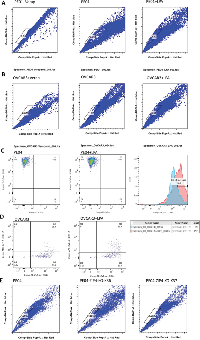 Figure 4: LPA and ZIP4 enhanced SP in HGSOC cells. (A-B) Under the conditions that ZIP4 expression was induced in PE01 and OVCAR3 cells, LPA treatment increased SP % ≥ 2 fold. (C) > 99% of PE04 SP cells were CD44 positive; LPA did not alter the percent of CD44+ cells, but increased cell surface expression in SP cells. (D) LPA increased the percentage of CD44+CD117+ cells in OVCAR3. Cells were starved in all LPA related experiments. (E) ZIP4-KO dramatically reduced SP % in PE04 cells. These cells were not starved from FBS when the FACS analyses were done. Representative results from ≥ three repetitive experiments are shown.