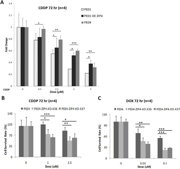 Figure 5: ZIP4 was involved in drug-resistance in HGSOC cells. (A) PE01-ZIP4-OE increased resistance to CDDP-induced cell death. (B-C) PE04-ZIP4-KO increased cell sensitivity to CDDP- and Dox-induced cell death.