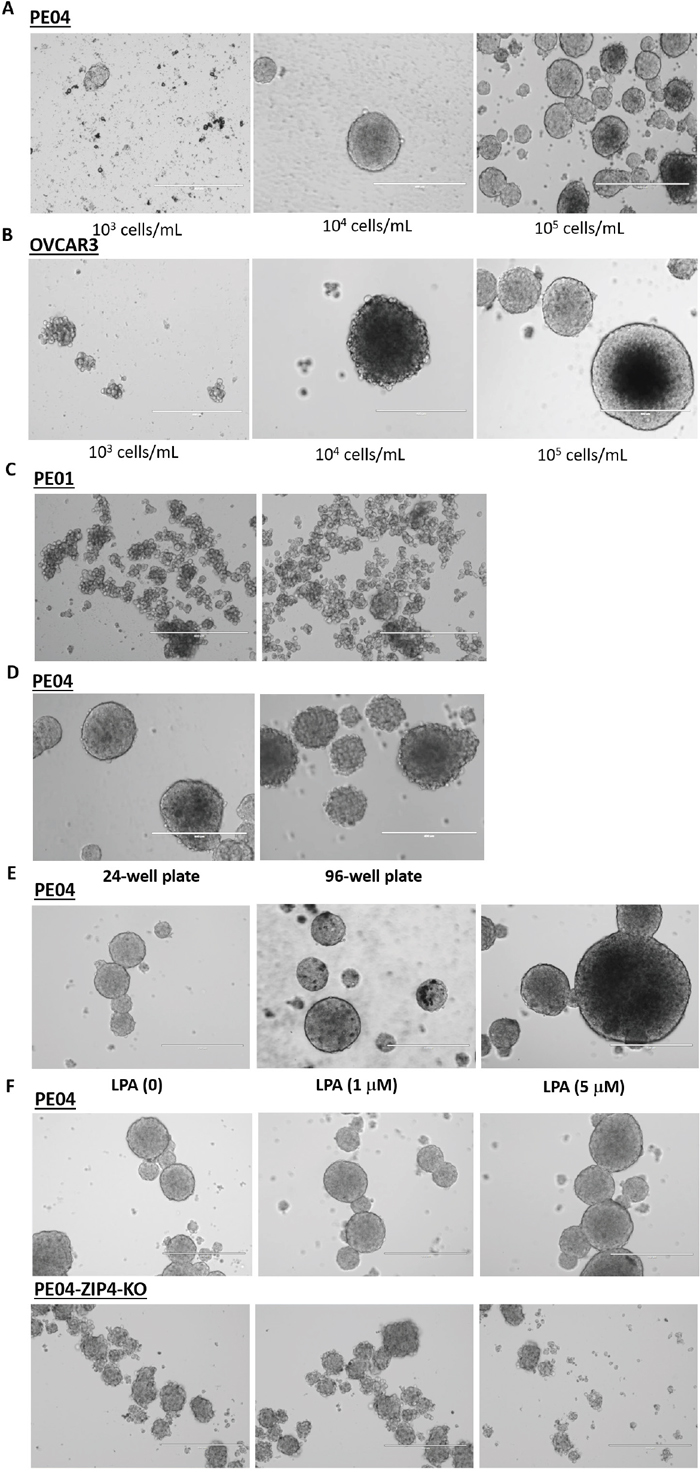 Figure 6: LPA and ZIP4 stimulated spheroid-formation in HGSOC cells. (A-B) PE04 and OVCAR3 cells were cultured in ultra-low-attachment plates; spheroid-formation was cell density dependent. Cells were cultured in stem cell conditions (see Methods for details) for 7 days. (C-D) Under the same conditions (1x104/mL in either 24- or 96-well plates), PE04 formed larger or more complete spheroids than PE01. (E) PE04 cells formed more complete spheroids under LPA treatment. (F) ZIP4-KO cells formed fewer and smaller spheroids when compared to control cells. The scale bars in D to I = 400 nm. Representative results from ≥ three repetitive experiments are shown.