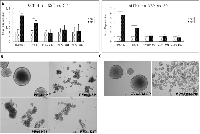 To further characterize the role of ZIP4 in SP cells, we separated SP and non-SP (FACS-sorted) in PE04 and OVCAR3 cells. Only SP cells formed spheroids and up-regulation of known EOC stem cell markers Oct4 and ALDH1 (Figures 7A - 7C).