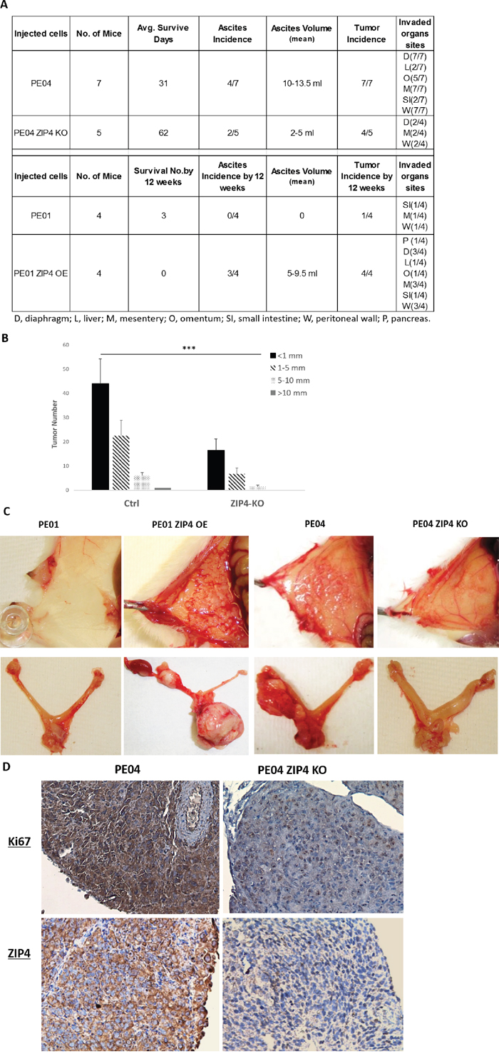 Figure 8: ZIP4 was positively involved in tumorigenesis in vivo. (A-B) Summary of tumor and ascites development of the control (PE01 and PE04), PE01-ZIP4-OE, and PE04-ZIP4-KO cells injected into NSG mice (n=4-7 in each group). (C) Representative tumor pictures of tumors on the peritoneal wall and the ovary. (D) Representative immunostaining of ZIP4 and Ki67 (a proliferation marker) in the tumor sections derived from wild type and ZIP4 KO PE04 cells.