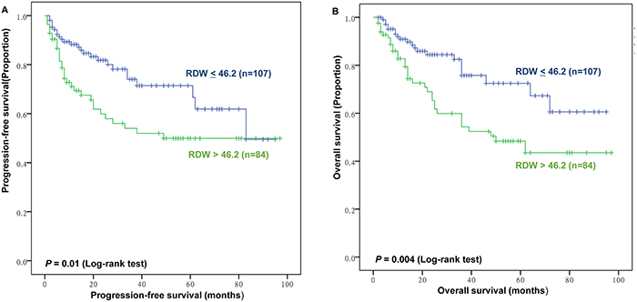 RDW was defined as the standard deviation (SD) of RBC volumes. Computed tomography (CT) or magnetic resonance (MR) of nasopharynx, neck, chest, and whole abdomen or positron emission tomography/CT (PET/CT) were utilized to evaluate patients’ disease.