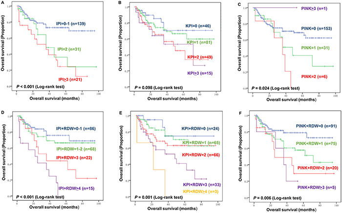Figure 4: Kaplan–Meier plots of overall survival (OS) by International Prognostic Index (IPI) (A), Korean Prognostic Index (KPI) (B), Prognostic Index of Natural Killer lymphoma (PINK) (C), Kaplan–Meier plots of OS by the new model combining RDW and IPI (D), and KPI (E), and PINK (F).