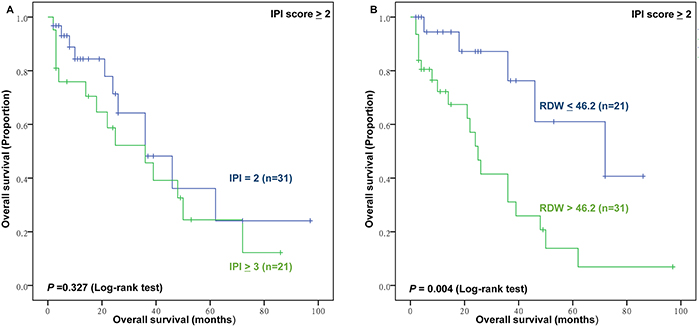 Figure 5: The prognostic value of high International Prognostic Index risk (IPI) and RDW in high IPI group. (A) Overall survival (OS) of patients with IPI score ≥2 according to IPI; (B) OS of patients with high IPI (IPI, score ≥2) according to RDW ≤46.2 fL versus RDW >46.2 fL.