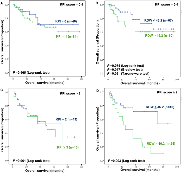 Figure 6: The prognostic value of Korean Prognostic Index (KPI) and RDW in low and high KPI group. (A) Overall survival (OS) of patients with low KPI (KPI, score 0-1) according to KPI (B) OS of patients with low KPI (KPI, score 0-1) according to RDW ≤46.2 fL versus RDW >46.2 fL. (C) OS of patients with high KPI (KPI, score ≥2) according to KPI (D) OS of patients with high KPI (KPI, score ≥2) according to RDW ≤46.2 fL versus RDW >46.2 fL.