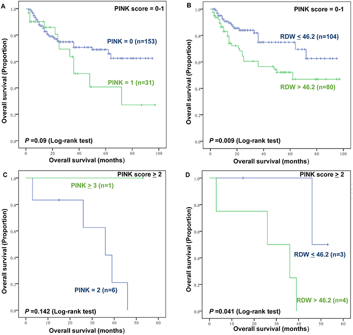 Figure 7: The prognostic value of Prognostic Index of Natural Killer lymphoma (PINK) and RDW in low and high PINK groups. (A) Overall survival (OS) of patients with low PINK (PINK, score 0-1) according to PINK; (B) OS of patients with low PINK (PINK, score 0-1) according to RDW ≤46.2 fL versus RDW >46.2 fL; (C) OS of patients with high PINK (PINK, score ≥2) according to PINK (D) OS of patients with high PINK (KPI, score ≥2) according to RDW ≤46.2 fL versus RDW >46.2 fL.