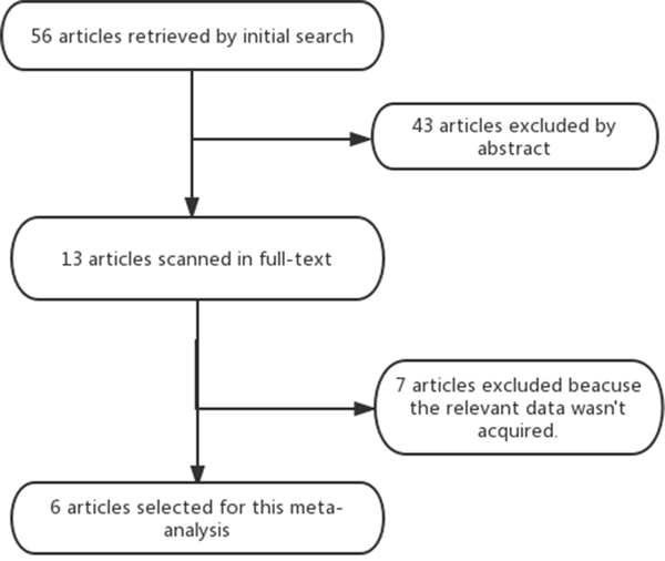 The electronic search yielded 56 articles; 43 articles were excluded by reading the abstract because they did not present any diagnostic information. We screened in 13 full-text articles and rejected 7 full-text articles. 6 articles [1–6] were eligible for meta-analysis (Figure 1). Four (66.7%) of the 6 studies stated that they were prospective. The clinical and imaging characteristics of all six included studies were shown in Table 1. A total of six studies (1350 patients) were analyzed for the accuracy of 18FDG PET-CT for the detection of SPCs, including 501 head and neck cancer patients with, 472 esophageal cancer patients, 277 lung cancer patients, 13 gastric cancer patients, and 87 patients with other subtypes of cancer. Of all six studies, 93.6% (1263/1350) of the first primary cancers are carcinomas of the upper aerodigestive tract. In five of all six studies [1–5], the results of 18FDG PET-CT was stated to have been assessed in a qualitative manner. And there was still one study [6] in which the assessing manner was both quantitative and qualitative.