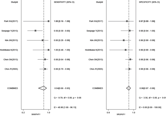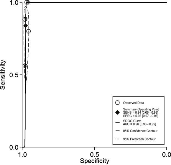 Figure 2 shows the forest plot of sensitivity and specificity for 18FDG PET-CT in the detection of SPCs. When considering all 6 studies (1350 patients) [1–6], the pooled sensitivity, specificity, positive likelihood ratio (PLR), and negative likelihood ratio (NLR) with 95% confidence interval for PET-CT were 0.84 (0.66 - 0.93), 0.98 (0.97 - 0.99), 35.8 (24.2 - 53.2), and 0.16 (0.07 - 0.38), respectively. When considering 4 studies about head and neck cancer (444 patients) [3–6], the pooled sensitivity, specificity, PLR, and NLR with 95% confidence interval for PET-CT were 0.80 (0.41 to 0.96), 0.97 (0.94 to 0.98), 25.3 (13.7 - 46.5), and 0.20 (-0.05 - 0.84), respectively.