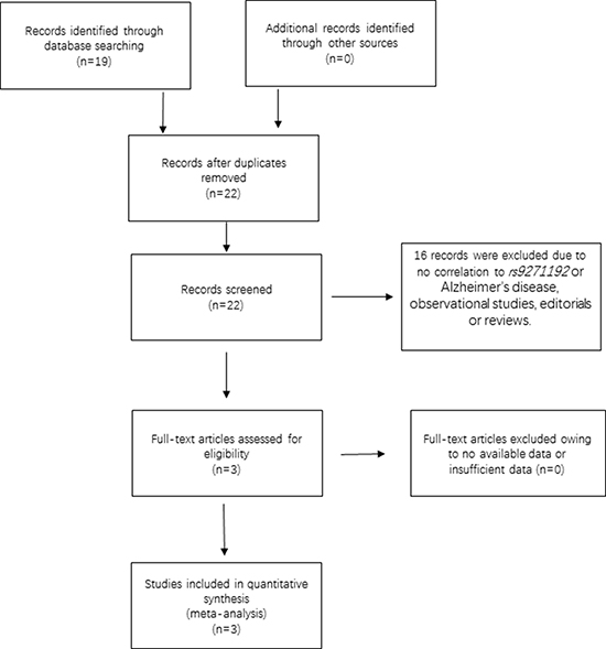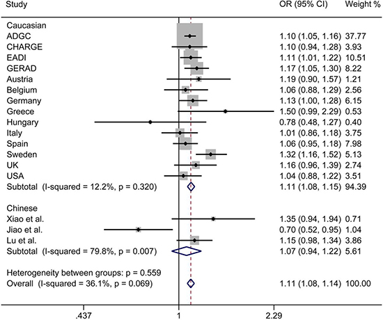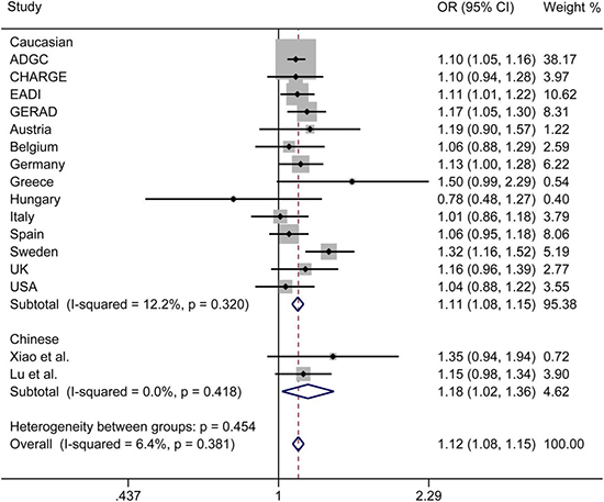 The initial search on computerized databases screened 19 articles. After 16 articles were excluded due to no correlation to rs9271192 or Alzheimer’s disease, observational studies, editorials or reviews, 3 eligible articles were found (Figure 1). We extracted the data of different populations from the three large studies [9, 16, 17] and ours, then regrouped them according to Caucasians and Chinese as subgroup for meta-analysis. We found there was a high heterogeneity (I2 = 79.8%) in the Chinese subgroup (Figure 2). Thus, we carried out the sensitivity analysis and found that the heterogeneity significantly declined when excluding the study of Jiao et al. [17]. There is no obvious heterogeneity (Caucasians subgroup: I2 = 12.2%, Chinese subgroup: I2 = 0.0%) in the two subgroups (Figure 3). Finally, we found the less frequent allele (C allele) at rs9271192 was risk factor for LOAD in Caucasians (OR = 1.11, 95%CI = 1.08–1.15) and Chinese (OR = 1.18, 95% CI = 1.02–1.36) (Figure 3). Notably, our study found rs9271192 showed significant association with LOAD in pooled populations (OR = 1.12, 95% CI = 1.08–1.15) (Figure 3) without evident analysis heterogeneity (I2 = 6.4%).