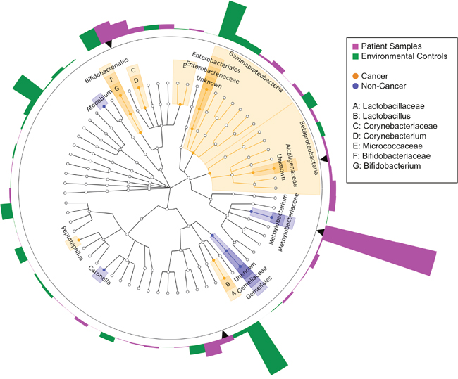 Figure 3: Cladogram of differentially abundant taxa in cancer and non-cancer patient breast tissue. Cladogram depicting phylogenetic relationship of taxa identified as significantly different (p < 0.05) by Wilcoxon rank-sum testing in cancer as compared to non-cancer patient samples. Each concentric ring of nodes represents a taxonomic rank, starting with phylum and ending with genus. Nodes highlighted in orange are increased in cancer relative to non-cancer samples, and nodes highlighted in blue are increased in non-cancer relative to cancer samples. Each bar in the circular bar plot surrounding the cladogram represents the difference in mean relative abundance of each genus in patient samples as compared to environmental controls, with a greater height indicating a larger difference. The color of the bars indicates the direction of the difference: higher in environmental samples (green), higher in patient samples (magenta). Black arrows indicate genera identified as significantly increased in patient samples as compared to environmental controls. Only Methylobacterium and an unknown genus of the family Alcaligenaceae were significantly differentially abundant in cancer and non-cancer samples, in addition to being significantly increased in patient samples above environmental controls.