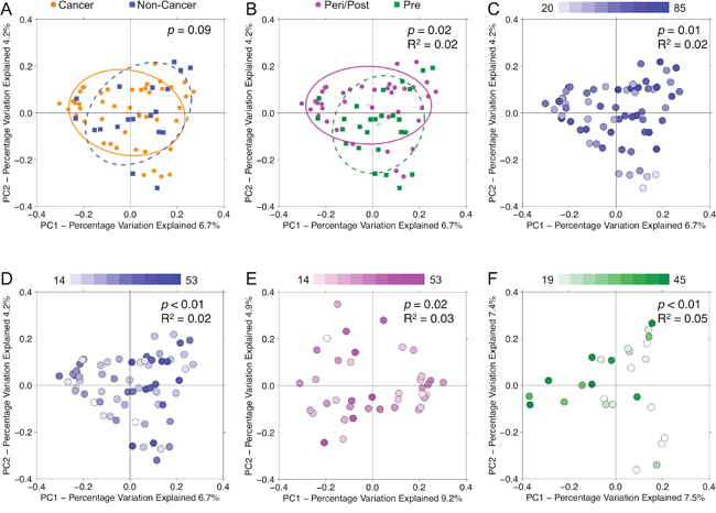Figure 6: Principal coordinates analysis plots on unweighted UniFrac distances of urine samples. Overall oral microbiomic diversity of patient samples as represented by the first two principal coordinates on principal coordinates analysis of unweighted UniFrac distances. Each point represents a single sample, with plus sign and ellipses representing the fitted mean and 68% confidence interval of each group respectively. While (A) cancer (orange) and non-cancer (blue) samples did not cluster distinctly, (B) peri/postmenopausal (magenta) and premenopausal (green) samples did cluster significantly differently. Additionally, urine samples separated by (C) age (younger to older: white to blue) and (D) BMI (younger to older: white to blue). Even when stratifying by menopausal status, urine samples continued to separate significantly by BMI in both (E) peri/postmenopausal and (F) premenopausal patients.