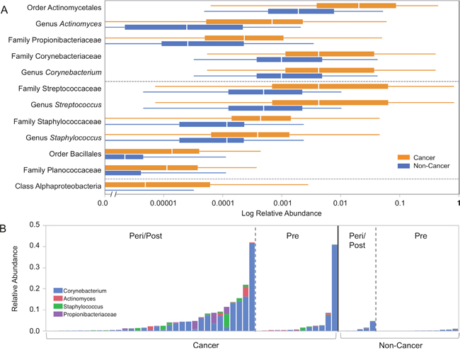 Figure 8: Relative abundances of differentially abundant taxa in cancer and non-cancer patient urine. (A) Box plots representing log relative abundances of taxa identified as significantly different (p < 0.05) by Wilcoxon rank-sum testing in cancer (orange) and non-cancer (blue) patient urine samples. Note that the x-axis is plotted on a logarithmic scale, with an axis break to allow for plotting of zero-values. (B) Stacked bar graph representing relative abundances of Corynebacterium (blue), Actinomyces (red), Staphylococcus (green), and Propionibacteriaceae (purple) in individual samples grouped by menopausal and cancer status. Streptococcus and Planococcaceae were not represented due to being significantly correlated with BMI [Supplementary Figure 3].