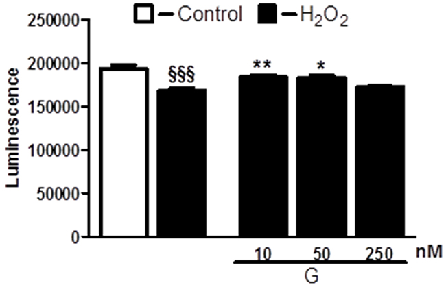 Figure 1: Dose-dependent effect of G on cell viability in response to oxidative stress. Treatment of cardiomyoblasts with G prevents H2O2-induced decrease of cell viability in a dose-dependent manner. The H9C2 were pretreated with G (10, 50, 250 nM) for 20 min and then exposed to 400μM H2O2 for 4h. Values are the means ± SEM for three experiments. *P < 0.05 vs H2O2 treatment; **P < 0.01 vs H2O2 treatment; §§§P < 0.001, vs control.