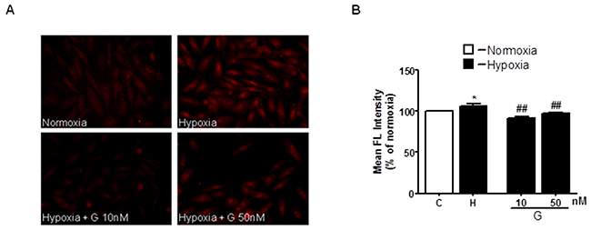 The excessive generation of ROS and impaired cellular metabolism are closely linked to cell death and myocardial damage [20]. To determine whether G could affect ROS generation, we examined the effects of G on mitochondrial superoxide (O2-) production using the MitoSOX Red fluorescent probe. As shown in Figure 3A, 3B, cell exposure to hypoxic stress caused a significant increase in O2- production as compared to normoxia. Importantly, treatment of H9C2 cells with 50 nM G markedly prevented hypoxia-induced O2- formation (Figure 3).