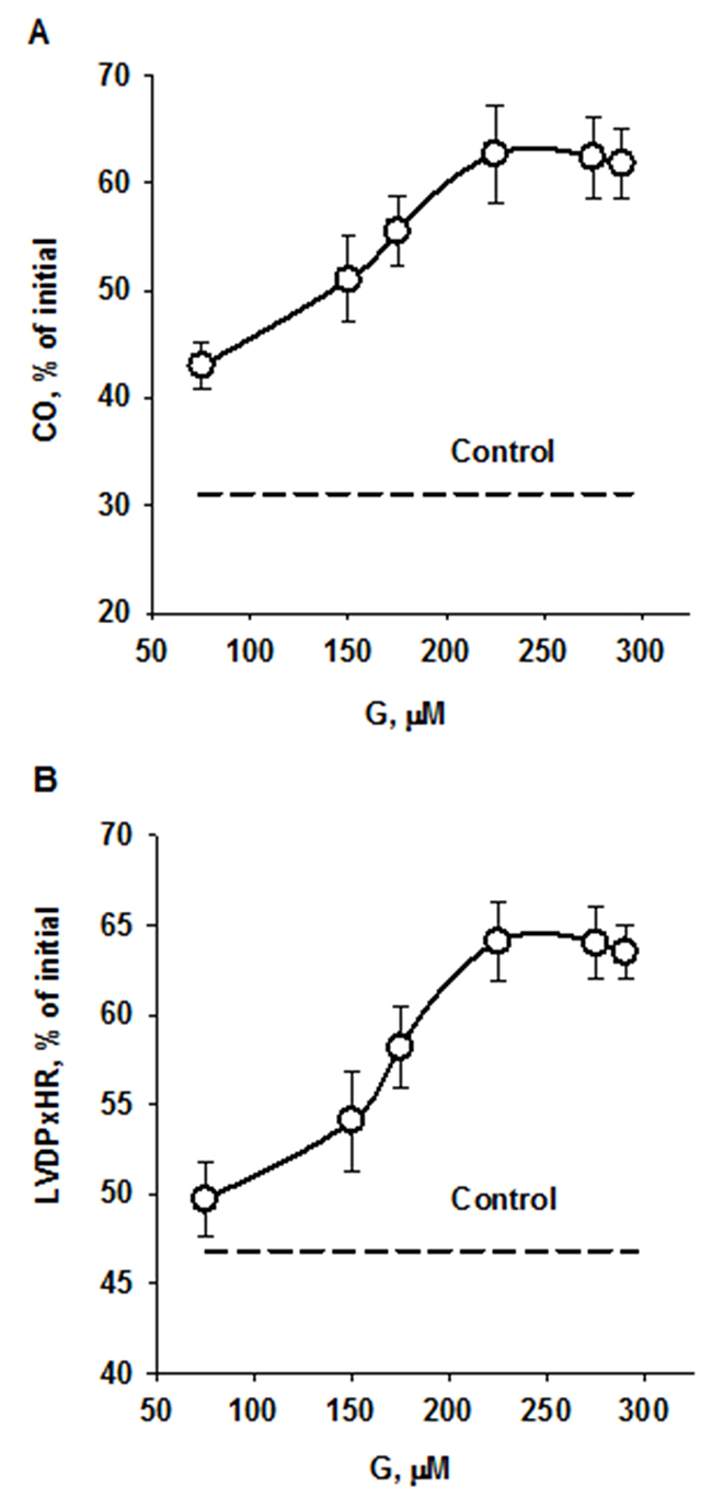 Figure 4: Effects of peptide G concentrations in KHB on recovery of cardiac output (A) and the index of contractile function intensity (B) at the end of reperfusion. Values are means ± SEM from 8 experiments and are expressed in percentage of the initial value. CO, cardiac output; LVDP×HR, the index of contractile function intensity. The dotted lines show recovery of the indices in control.