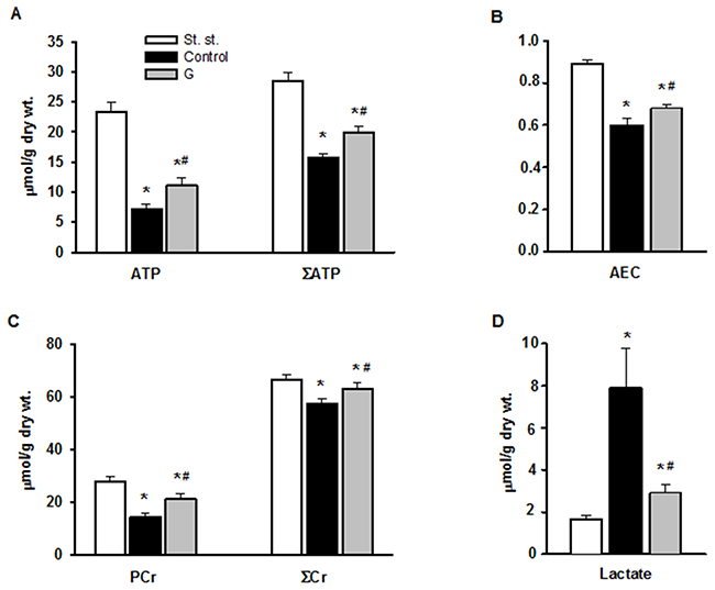 Figure 5: Effect of G infusion on energy state of isolated rat heart at the end of reperfusion. St. st. - steady state; G - 5-min infusion of 225 μ M G after ischemia. (A) Myocardial contents of ATP and ΣAN=ATP+ADP+AMP. (B) Adenylate energy charge (AEC) = (ATP+0.5ADP)/ΣAN. (C) Myocardial contents of PCr and total creatine ΣCr=PCr+Cr. (D) Myocardial content of lactate. Values are the means ± SEM from 8 experiments. *P < 0.05 vs. steady state; #P < 0.05 vs. control.