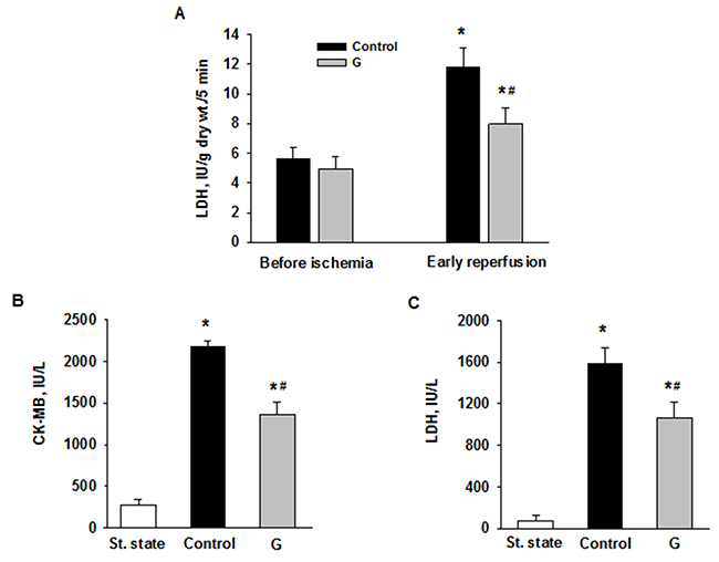 Figure 6: Effects of G administration on necrosis markers in ex vivo and in vivo models of myocardial I/R injury. (A) LDH release in myocardial effluent from isolated perfused rat heart. Control - postischemic infusion of KHB; G - postischemic infusion of KHB with 225 μM G. Values are the means ± SEM of 8 experiments and are expressed in IU/g dry wt. for 5-min Langendorff perfusion before or after global ischemia (early reperfusion). * p<0.05 vs. the value before ischemia; # p<0.05 vs. the value in control. Activities of LDH (B) and CK-MB (C) in blood plasma in rats in vivo. St. state - steady state; Control – i.v. administration of saline at the onset of reperfusion; G - i.v. administration of peptide G (1.4 μmol/kg) at the onset of reperfusion. Values are the means ± SEM for 8 experiments.* P<0.05 vs. steady state; # P<0.05 vs. control.
