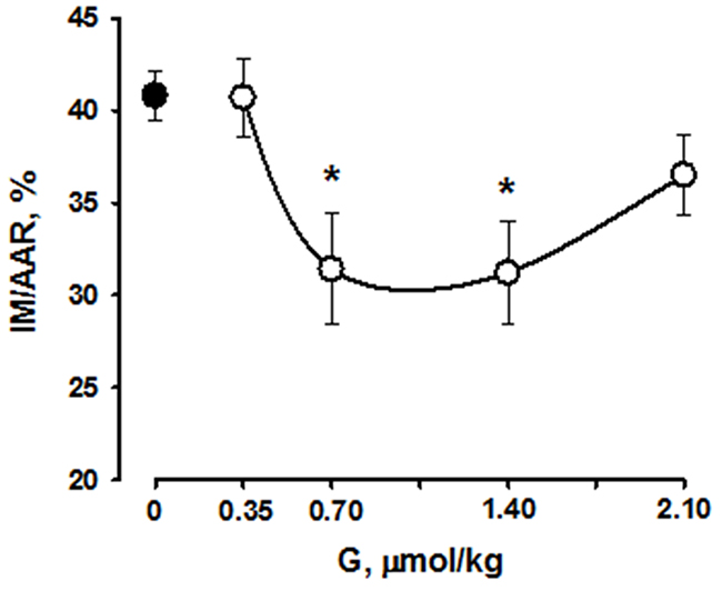 In control, after 30-min stabilization of hemodynamic parameters (steady state), LAD coronary artery was occluded for 40 min to simulate regional ischemia; the duration of subsequent reperfusion was 1 h. Prior to intravenous administration, G was dissolved in saline. In the experimental series, G was administrated by i.v. bolus injection at the onset of reperfusion at doses of 0.35, 0.70, 1.40 and 2.1 μmol/kg (groups G-0.35, G-0.7, G-1.4 and G-2.1, respect.) An equal volume of saline (0.5 ml) was injected in control. At the end of experiments, LAD coronary artery was reoccluded and 2 ml of 2% Evans Blue (Sigma, USA) solution was injected through the jugular vein to distinguish the myocardial non-ischemic area from the area at risk (AAR).