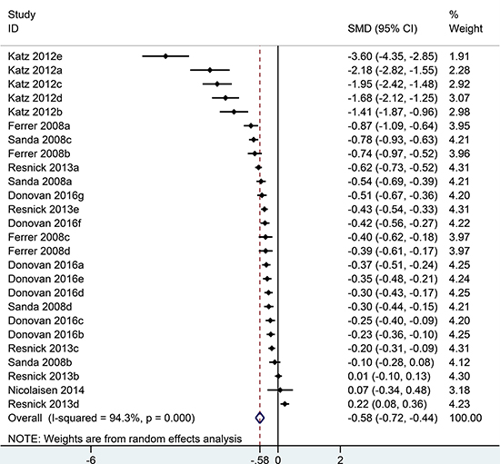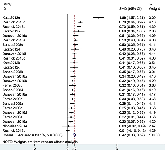 Stata 12.0 was used for statistical analysis and GraphPad Prism 6.0 was used to draw the bar chart in the sub-group analysis. Standardized mean difference (SMD) was used to compare continuous variables with the same domain. All results were described by 95% CI. Health-related QOL data are measured by EPIC in urinary, bowel, sexual domains in this analysis. A summary score constructed for each domain was collected, which range from 0 to 100 with high values indicate better functioning and quality of life. For comparison purposes, men treated with RP were set as the experimental group and men treated with EBRT were set as the control group. That is to say, an effect size < 0 reflects worse QOL in men with RP and an effect size > 0 reflects worse QOL in men with EBRT. Heterogeneity between studies was evaluated by Cochran’s Q test and I2 test. Studies with P < 0.05, I2 > 50% were deemed heterogeneous, and was analysed by the random effect model. Sub-group analyses were conducted in urinary, bowel, sexual domains stratified by follow-up time points.