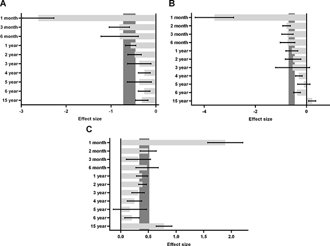 Figure 5: Sub-group analyses in urinary (A), sexual (B) and bowel (C) QOL stratified by follow-up time.