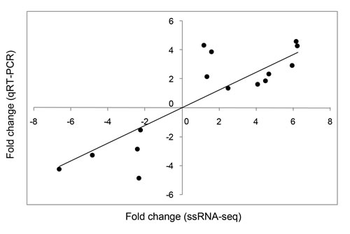 Figure 1: Correlation between relative fold changes in expression based on ssRNA-seq and qRT-PCR analyses. 15 differentially expressed genes (DEGs) identified by ssRNA-seq were assessed by qRT-PCR of the same samples. Each black dot indicates the relative expression fold change between the treatment and control groups according to ssRNA-seq (x-axis) and qRT-PCR (y-axis). IBM SPSS Statistics 22 was used for statistical analysis.