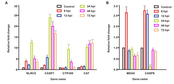 Correlation analysis of the fold changes in gene expression ratios between the ssRNA-seq and qRT-PCR data showed a highly significant positive correlation (Pearson’s correlation coefficient, r = 0.878, P < 0.001; Figure 1). Therefore, the qRT-PCR analysis supported the accuracy of the ssRNA-seq methods in this study. In the survey of gene expression, our results showed that the expression level of NLRC5 was significantly up-regulated at 6, 24, and 48 hour-post injection (hpi) compared with levels in the control group and reached a peak at 24 hpi. The expression level of CASP1 was significantly elevated at 12, 24, 48, and 72 hpi, reaching a peak at 24 hpi. The expression level of CYP450 was significantly up-regulated only at 24 and 48 hpi. The expression profile of CAT showed a continuous increase in expression over 72 hpi, including significant up-regulation at 24, 48, and 72 hpi. MDA5 was significantly up-regulated at 6 hpi, but its expression fell below the level in controls at 12, 24, 48, and 72 hpi. The expression level of CASP6 was significantly up-regulated at 6 and12 hpi, showing the highest expression at 6 hpi, but significantly decreased at 24 hpi, after which the expression level fell below that in controls at 48 and 72 hpi (Figure 2).