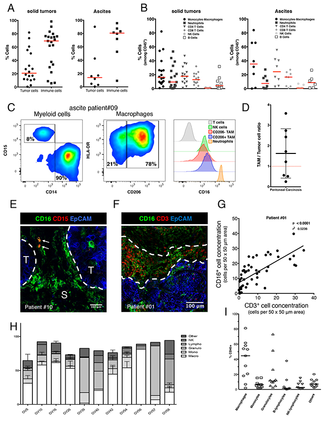 Figure 3: Phenotypic characterization of human ovarian tumors infiltrating immune cells. (A) Relative quantification of tumor cells (defined as EpCAM+/CD45- cells) compare to immune cells (defined as EpCAM-/CD45+ cells) in 21 solid tumors (left panel) and 8 ascites (right panel) by multiplexed flow cytometry. Results are analyzed after doublet and dead cells exclusion. Data are expressed as the cell percentage within the singlet living population. Each dot represents a different patient and the median is shown (red bar). Both solid tumor and ascites are most frequently composed of a high proportion of immune cells. (B) Immune cell subset characterization in 21 solid tumors (left panel) and 8 ascites (right panel) by multiplexed flow cytometry. Results are analyzed after doublet and dead cells exclusion. Data are expressed as the cell percentage within the singlet living immune cell population (defined as EpCAM-/CD45+ cells). Each dot represents a different patient and the median is shown (red bar). Immune infiltrate of both solid tumor and ascites is composed of two major subsets: Macrophages (TAMs) and T cells (TILs). While NK cells remain scarce. (C) Immune cells composing a representative tumor sample (ascites from patient #09) were analyzed by flow cytometry for TAM phenotype (left and middle panels) and for surface expression of Fc gamma RIII (right panel). (D) Represented E/T ratio as the total CD16 positive immune cells versus tumor cells was measured by flow cytometry in 8 OC patients. The average Effector/Target ratio is 1.8/1(black bar). (E-G) Distribution of TAMs and TILs in the tumor microenvironment: (E) Representative multiplexed immunofluorescence microphotographs showing CD16 expression (green fluorescence channel) compared to CD15 expression (red fluorescence channel) in a fresh human ovarian malignant biopsy (patient #10) Tumor nests were identified by EpCAM expression (T, blue fluorescence channel). S, Stroma. CD16 expressing TAMs are mostly in direct contact with the tumor/stroma border (white dashed lines) and are even able to infiltrate into the core of the tumor nest while neutrophils (CD15+/CD16+ double positive cells, white arrows) are rarely found and more localized in distal stromal areas. Representative of 16 OC patient’s biopsies. (F) Representative multiplexed immunofluorescence microphotographs with CD16 expressing cells including TAMs (green fluorescence channel) compared to CD3 expressing T cells (red fluorescence channel) in a fresh human ovarian malignant biopsy (patient #01). Tumor nest is identified by EpCAM expression (T, blue fluorescence channel). (G) Positive correlation between TAMs and TILs concentration expressed as the number of cells per 50 x 50 μm area. TAMs and TILs tend to localize in the same peritumoral areas fostering cell-to-cell contact between those two populations. (H)(I) Proportion of immmune cells present (CD45+ cells) in various OC PDXs.