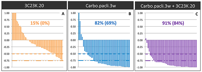 Figure 7: Overall Response Rate (ORR) after 3C23K administration in ovarian cancer PDXs. The ORR was defined as the relative tumor volume variation (RTVV) of each treated mouse calculated from the following formula: [(Vt/Vc) –1], where Vt is the volume of the treated mouse and Vc the median volume of the corresponding control group at a time corresponding to the end of treatment.(A) ORR of mice treated by 3C23K at a dose of 20 mg/kg per injection, twice a week. (B) ORR of mice treated by carboplatin at a dose of 66mg/kg and paclitaxel at a dose of 30 mg/kg per injection, every 3 weeks. (C) ORR of mice treated by carboplatin at a dose of 66mg/kg and paclitaxel at a dose of 66 mg/kg, every 3 weeks, combined with 3C23K at a dose of 20 mg/kg per injection, twice a week. The two indicated percentages indicate the proportion of mice with a [(Vt/Vc) –1] lower than -0.5 and 0.75, respectively.
