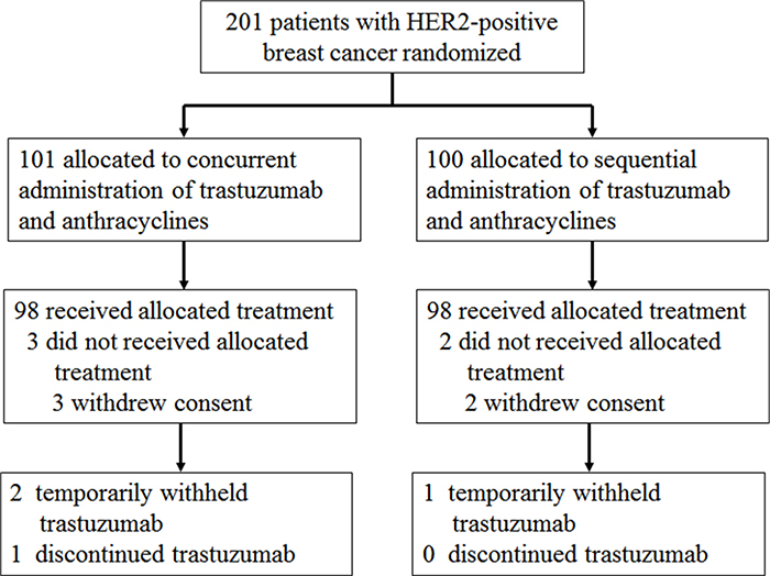 Eligible participants were randomly assigned, in a 1:1 ratio, to receive adjuvant therapy with trastuzumab administered concurrently with anthracyclines (concurrent group) or sequentially to anthracyclines (sequential group). The chemotherapy regimen and radiation therapy was chosen before randomisation. Randomisation was done by a computer-generated randomization sequence, using a permuted-block randomisation method with a block size of four.