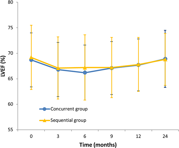 The cardiac safety events were graded according to the NCI-CTC, version 2.0. Trastuzumab and anthracyclines was well tolerated in both the concurrent group and the sequential group. There was no patient documented congestive heart failure or cardiac death. The primary cardiac safety event in both treatment groups was an asymptomatic decrease in the left ventricular ejection fraction. Nineteen patients (19.4%, 95% CI 12.4-28.9) in the concurrent group and 22 patients (22.4%, 95% CI 14.9-32.2) in the sequential group met the criteria for cardiac events (odds ratio 0.831, 95% CI 0.417-1.656, P = 0.598, Table 2). No difference between the two groups was found in the mean LVEF determined at baseline, every 3 months during trastuzumab administration, and at 24 months after the first dose of trastuzumab (Figure 2). In the concurrent group, more than 10% but less than 20% reduction in LVEF (NCI-CTC Grade 1) was detected in 17 patients (17.3%, 95% CI 10.7-26.6), whereas a reduction higher than 20% in LVEF or a decline below 50% (NCI-CTC Grade 2) was established in two patients (2.0%, 95% CI 0.3-7.9). On the other hand, in the sequential group, 21 patients (21.4%, 95% CI 14.0-31.1) exhibited a Grade 1 LVEF reduction, and 1 patient (1.0%, 95% CI 0.1-6.4) manifested a Grade 2 reduction. Trastuzumab was temporarily withheld in two participants in the concurrent group and one patient in the sequential group with Grade 2 LVEF reduction. The LVEF values of these three patients recovered in four weeks, and trastuzumab administration was continued. Trastuzumab was permanently discontinued in one patient in the concurrent group after the application of 14 doses because of hearing loss.