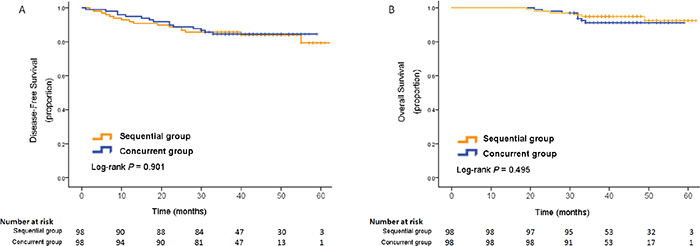 There were 14 deaths occurred during follow-up, eight in the concurrent group and six in the sequential group. The Kaplan-Meier estimates of the OS at five years was 91.2% in the concurrent group and 92.4% in the sequential group (hazard ratio, 1.443; 95% CI 0.500–4.167; P = 0.495; Figure 3). The difference was also non-significant.