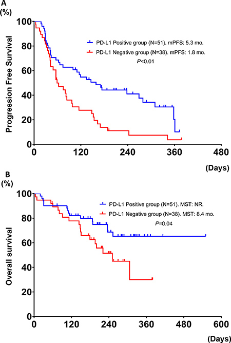 In the 89 (72%) patients who had sufficient tumor tissues to evaluate quantifiable PD-L1 expression, 38 (43%) patients had PD-L1 negative expression, and 51 (57%) had PD-L1 positive expression, including 9 patients with more than 50% (≥ 50%) PD-L1 expression (Table 1). The ORR was significantly higher in patients with PD-L1 positive expression than those with PD-L1 negative expression (33% vs. 1.1%, P < 0.01). There was no difference in the ORR in patients with between 1–49% and ≥ 50% PD-L1 expression (33% vs. 33%, P > 0.99). The PFS and OS were significantly longer in patients with PD-L1 positive expression compared to those with PD-L1 negative expression (median PFS: 1.8 (95% CI: 1.4–2.8) months vs. 5.3 (95% CI: 2.2–9.3) months (Figure 3A), P < 0.01, and median OS: 8.4 (95% CI: 5.0-NR) months vs. NR (8.4-NR) months, P = 0.04) (Figure 3B).