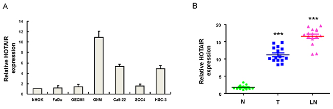 Figure 1: Relative expression of HOTAIR in 6 OSCC cell lines and OSCC patients with localized and metastatic tumors (A) The expression level of HOTAIR was markedly elevated in lymph node metastatic GNM cell line compared to normal human oral keratinocytes (NHOK); (B) Adjacent noncancerous matched tissues (NCMT; n=15), and paired tissue samples from tumor (T; n=15) as well as lymph node metastatic (LN; n=15) lesions in OSCC patients were subjected to analysis for the expression levels of HOTAIR. The expression level of HOTAIR in the samples of lymph node metastatic tumors (LN) was further upregulated compared with localized tumors (T). ***p <.05 compared to non-tumor (N) tissue.
