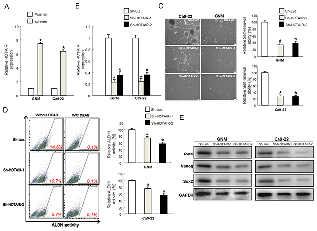 Previously, oralspheres from nonadhesive culture system have been shown to possess CSCs properties [31]. And ALDH1 has been shown to be sufficient to serve as a single and specific marker for identification of head and neck squamous cell carcinoma cancer stem cells [32, 33]. We selected two cell lines, GNM and Ca9-22, which exhibited significantly increased level of HOTAIR (Figure 1) to conduct the following experiments. Results from quantitative RT-PCR analysis confirmed that HOTAIR levels were even higher in oralspheres compared with parental cells (Figure 2A). To further investigate whether HOTAIR plays a role in maintaining CSCs hallmarks, loss-of-function mutation was generated in GNM and Ca9-22 sphere-forming oral cancer stem cells using small hairpin RNA targeting HOTAIR (sh-HOTAIR-1 and sh-HOTAIR-2), and lentiviral vector expressing shRNA against luciferase (sh-Luc) was used as control. Real-time RT-PCR showed that the expression level of HOTAIR was markedly reduced in sh-HOTAIR cells (Figure 2B). Knockdown of HOTAIR in OSCC-CSCs suppressed their secondary sphere-forming ability (Figure 2C) and reduced ALDH1 activity (Figure 2D). Moreover, the expression of various pluripotent stemness markers was also decreased (Figure 2E and Supplementary Figure 1).