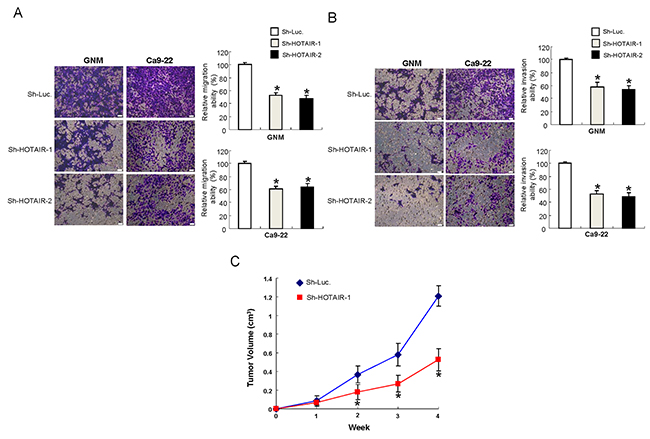 Figure 3: Inhibition of the metastatic potential in vitro and oncogneicity in vivo after silencing HOTAIR expression in OCSCs (A) Migration and (B) invasion abilities of OCSCs were attenuated after downregulation of HOTAIR, data shown as mean ± SD of three independent experiments. *p <.05 compared to control lentiviral vector (sh-Luc). (C) Nude mice were subcutaneously injected with sh-HOTAIR-1 or sh-Luc transfected OSCC-CSCs, and the mice were monitored for 4 weeks. OSCC-OCSCs with reduced HOTAIR expression showed smaller tumor size, indicating the slower tumor growth in xenotransplantation model.
